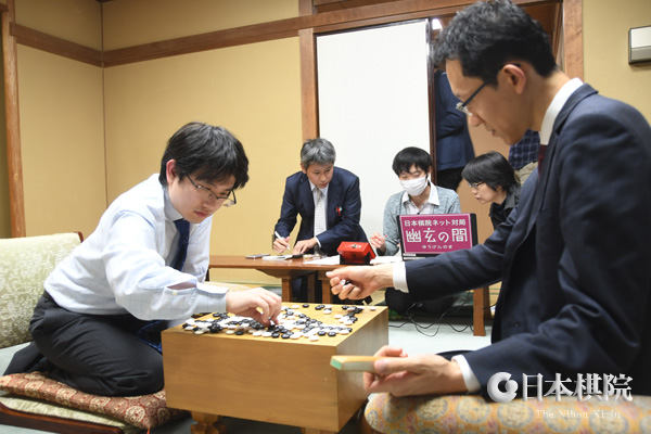 11月8日、東京千代田区の日本棋院東京本院では、山下敬吾九段と河野臨九段で第43期棋聖戦挑戦者決定変則三番勝負が行われた。