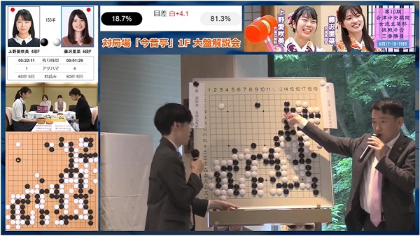 上野愛咲美女流立葵杯に藤沢里菜女流本因坊が挑戦する第10期会津中央病院・女流立葵杯(主催:日本棋院、後援:毎日新聞社、協賛:一般財団法人温知会、協力:関西棋院、福島民報社、日本棋院福島県支部連合会)の挑戦手合第1局が6月17日(土)9時に福島県会津若松市 「今昔亭」で打たれ、藤沢の白番中押し勝ちとなった。