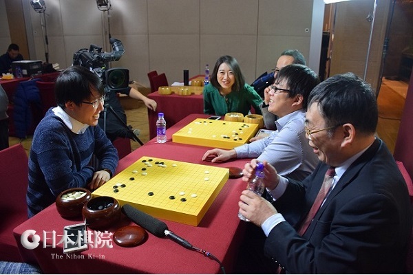 控室で第2戦の行方を見守る井山(左)。向かいに座るのは聶衛平九段(手前)と孔令文七段