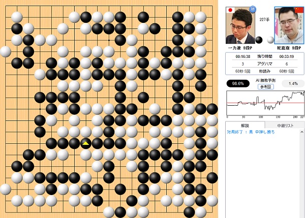 一力遼九段が2022年1月16日(日)に行われた中国団体リーグ戦甲級リーグプレーオフに洛陽玉泉谷チームで参戦し、衢州爛柯チームの柁嘉熹九段と対戦。結果は一力が227手までで黒番中押し勝ちした。