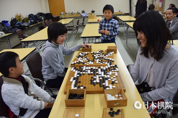 1回戦で棋譜入力をしてくれた地元の子供たちに藤沢女流本因坊が指導碁のプレゼント