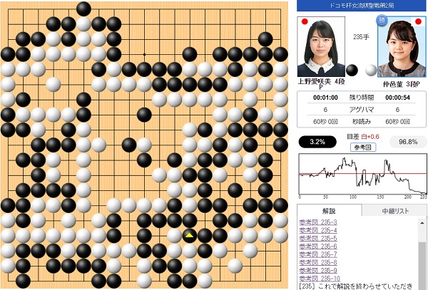連覇を目指す上野愛咲美女流棋聖に仲邑菫三段が挑戦する第26期ドコモ杯女流棋聖戦挑戦手合三番勝負(主催:日本棋院/協賛:株式会社NTTドコモ/協力:関西棋院)が1月26日(木)に日本棋院本院(東京・市ヶ谷)で打たれ、仲邑が235手までで白番半目勝ちをおさめ1勝1敗のタイとなった。