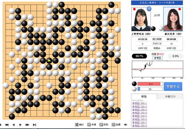 挑戦者・上野愛咲美女流立葵杯が黒番中押し勝ちをおさめ、シリーズ2勝0敗でタイトル奪取となった。