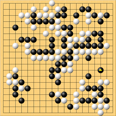 一力七段「中央を切らず(白76)に、右辺を押さえて(白104)地合で勝負することも考えたが自信がなかった。」