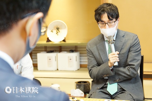 - 「(107サガリについて)右辺のコウはずっと残っているんですけど(上に)ノビて右辺白を生かして左辺に回っててもそれなりにいい勝負かなと思っていたんですけれども、サガリが成立するのであればそちらのほうが厳しいかなと思ってやりました。 封じ手の前のトビと封じ手のコスミが少しぬるかったかもしれないがちょっと他の打ち方もわからなかったです。64と飛ばれたときはあんまり自信が無かったです。コウになって右辺に寄り付く展開になって一応、全局的に厚いかなと思ったんですけど、まだまだ右辺白がどの程度の生き形になるかという形勢だったと思います。また来週にあるので気を引き締めて頑張りたいと思います」