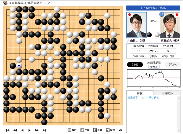 3連覇を目指す井山裕太名人に芝野虎丸九段が挑戦する 第47期名人戦挑戦手合七番勝負(主催:朝日新聞社・日本棋院・関西棋院、協賛:株式会社明治、マニフレックス)の第7局が山梨県甲府市「常磐ホテル」で11月2日(水)・3日(木)に打たれ、芝野が中押し勝ちをおさめ4勝3敗で奪取、3期ぶりの名人返り咲きとなった。