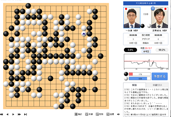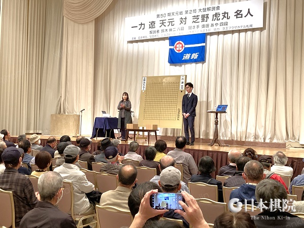 連覇を目指す一力遼天元に芝野虎丸名人が挑戦する 第50期天元戦挑戦手合五番勝負(主催:新聞三社連合・日本棋院・関西棋院)の第2局が10月18日(金)に北海道札幌市「京王プラザホテル札幌」で打たれ、白番の芝野が中押し勝ちをおさめシリーズ成績1勝1敗とした。終局時刻は16時27分。残り時間は一力2分、芝野3分。