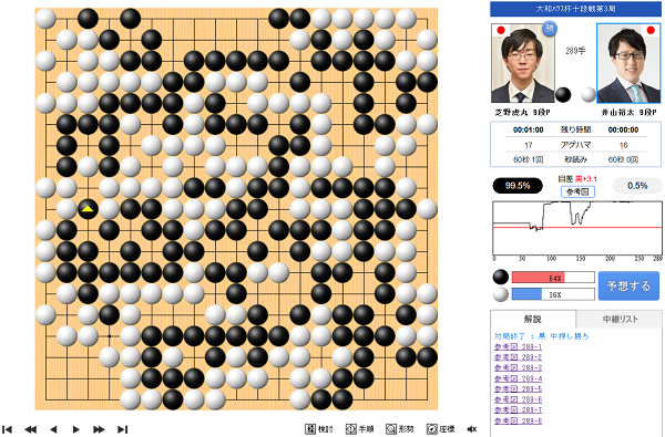 芝野虎丸九段が黒番中押し勝ちをおさめシリーズ3勝0敗でタイトル奪取となった。289手完。終局時刻18時5分、残り時間は両者ともに2分。
