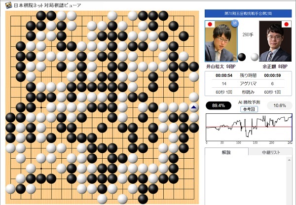 連覇を目指す井山裕太王座に余正麒八段が挑戦する 第70期王座戦挑戦手合五番勝負 (主催:日本経済新聞社・日本棋院・関西棋院) 第2局が11月11日(金)に京都府京都市「ウェスティン都ホテル京都」で打たれ、井山が半目勝ちをおさめシリーズ2連勝。防衛まであと1勝とした。