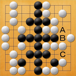 | 1図 正解(C) 黒1が正解。無条件生きとなります。 まずワリ込んで、白の応手を問う必要があるのです。切らずに白2には、黒3とハネ出します。これも応手打診。専門用語で「様子見」といい、相手の応手によって続く最善手が変わります。続いて次図。 |