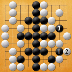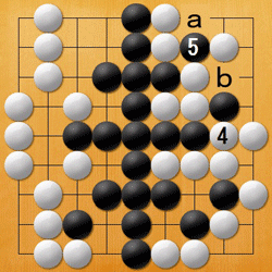 | 2図 正解続1 白4と切れば、黒5のホウリ込みが手筋。白aと取れば、黒bにアテて白を取れます。なので次図。 |