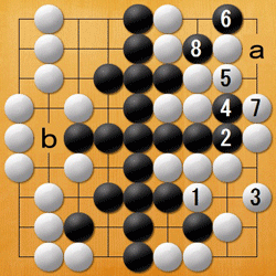 | 5図 正解変化2 正解のワリコミ(初手)に対して、白1と切った場合は、黒2とアテます。白3に黒4と出て、白5に黒6のツケ。白7に黒8とウッテガエシで白二子を取って生き。黒aのオイオトシと、黒bの後手一眼(合わせて二眼)が見合いです。 |