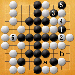 | 6図 失敗1(A) 黒1のハネ出しは、白2と切られて失敗。黒3に白4。黒5で一眼できますが、この手順では右側の白が生きているので、白6と左側の眼を奪われると黒は一眼のみ。死んでいます。続いて黒aのアテにはツガず、白bです。二子を抜いても打ち欠かれて眼になりません。 |