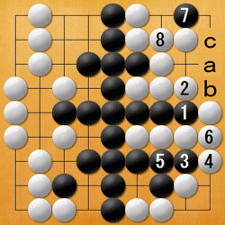 | 7図 失敗2(B) 黒1と出るのは、白2とオサえられて失敗。それから黒3のワリコミは手順が悪い。白4から6と受けられて、手になりません。黒7とツケても白8と応じられ、白は生きています。黒a、白b、黒cと打っても白は手抜き、黒の後手ゼキです。「隅のマガリ四目」ではありません。 |
