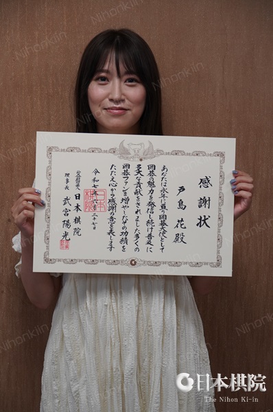 また、贈呈式の後には永年にわたり囲碁大使として囲碁の魅力の発信を続けてきた戸島花さんに日本棋院より感謝状が贈呈された。