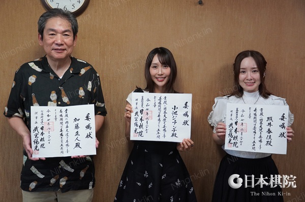 新たに囲碁大使となった3人に委嘱状が贈呈された。左から加藤正人さん、小池ジョアンナさん、照井春佳さん。