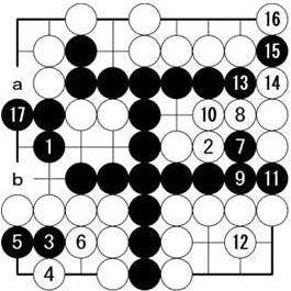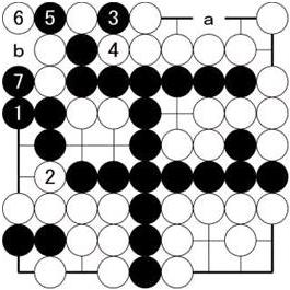 | 正解続 黒1(前図の黒17)に白2と打てば、黒3、5とホウリ込んで、黒7。白aの生きに、黒bでオイオトシ。 |