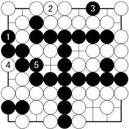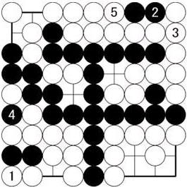 | 参考1 コウを争ってセキにしようとするなら白1。すぐコウを取ったり、共通ダメを詰めたりせず、中手のダメを先に詰める黒2が攻め合いの手筋。白3と換わってから黒4のコウ取り。白5の二子取りに |