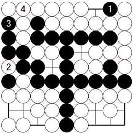 | 参考2 黒1と中のダメを先に詰め、白2コウ取りに、黒3、白4、黒コウ取り。白からコウ立てがなく(白はパスよりない)、白の大石が取れます。この変化は正解図の続きですが、詰碁としての正解には関係ありません。詰碁は部分的な死活のみを問題とし、損得や全局的勝敗は問わないのです。 |