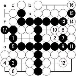 | 正解変化 黒1から3に対して、白4と死んで打ち、白が攻め合いを目指すとどうなるか? 黒5が攻め合いの急所。これで黒の手数が延びるため、白がfと攻め合えば、黒6で黒の三手勝ちになります。白6には黒7から17まで。続いて白aには、黒b、dとホウリ込んで、黒f。オイオトシと三目中手が見合いです。 |