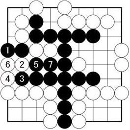| 失敗1(A) 黒1のサガリは失敗。白2とハネられて死にます。黒3に白4が肝要。黒5、白6、黒7に続いて |