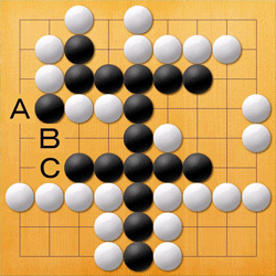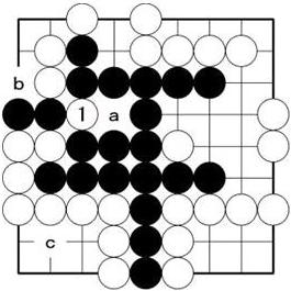 | 失敗1続 白1と打ち欠いて死に。黒aに白b、黒ツギ(1)、白c。 |