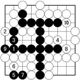 | 失敗2 黒1のオサエは、白2とアテられて失敗。無条件の生きがありません。黒3に白4。黒5と隅の急所に置いて、無条件生きはありませんが、白6、黒7となって、この隅はコウ。黒の生死は、隅の白をコウで取れるかどうかにかかります。詰碁ですから、コウは無条件生き(正解)に劣ります。実戦的には、正しく打てば黒はコウに勝てますが...。 形の美しさを第一に考えた9路盤の文字詰碁。全局問題ではなく、これは詰碁です。 |