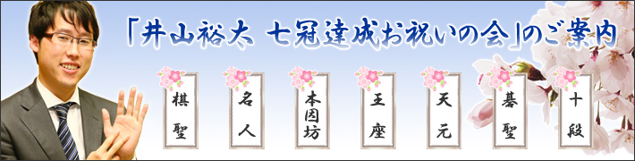 この前人未到の偉業を讃え、囲碁ファン並びに日頃よりご支援ご協力を頂いております関係者の皆様にお集まりいただき、井山裕太七冠や著名棋士とのひと時をお楽しみ頂きたく、「七冠達成お祝いの会」を下記の通り開催致します。