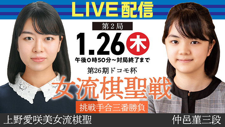 株式会社 囲碁将棋チャンネル(本社:東京都千代田区、代表取締役社長:倉元健児)は1月26日(木)、月額390円(税込)で生中継やVOD配信が視聴できるYouTubeの同社インターネット会員サービス「囲碁将棋プラス」で、『第26期ドコモ杯女流棋聖戦』挑戦手合三番勝負第2局 上野愛咲美女流棋聖 vs 仲邑 菫三段を生中継致します。