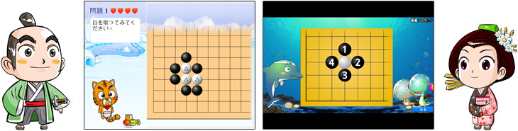 可愛いキャラクターがアニメーションの講義を通してわかりやすく説明しますので、小さなお子様はもちろん大人の方まで簡単に囲碁を覚えることができます。