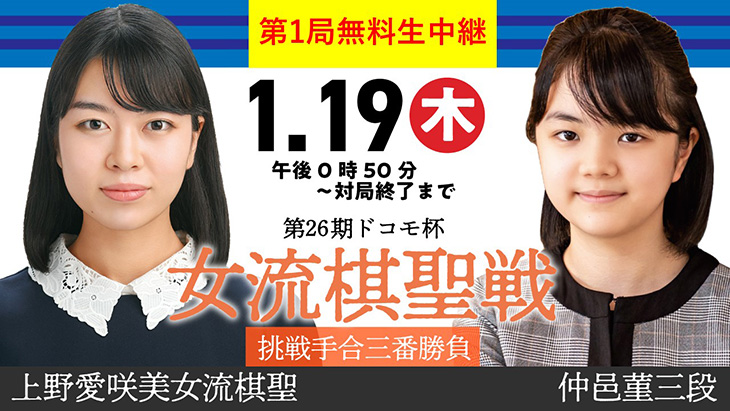 株式会社 囲碁将棋チャンネル(本社:東京都千代田区、代表取締役社長:倉元健児)は1月19日(木)、YouTubeの同社インターネット会員サービス「囲碁将棋プラス」で『第26期ドコモ杯女流棋聖戦』挑戦手合三番勝負第1局 上野愛咲美女流棋聖 vs 仲邑 菫三段を無料で生中継致します。