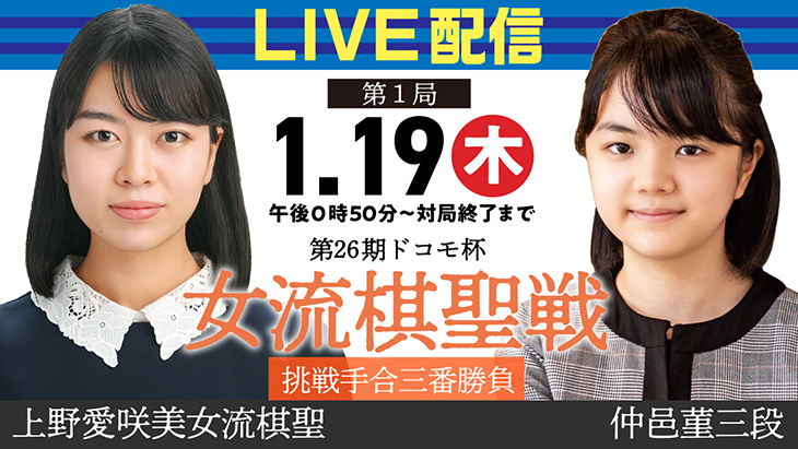 株式会社 囲碁将棋チャンネル(本社:東京都千代田区、代表取締役社長:倉元健児)は、昨年12月にYouTubeとニコニコチャンネルに開設したインターネット会員サービス「囲碁将棋プラス」で1月19日(木)から、『第26期ドコモ杯女流棋聖戦』挑戦手合三番勝負 上野愛咲美女流棋聖 vs 仲邑 菫三段を生中継致します。
