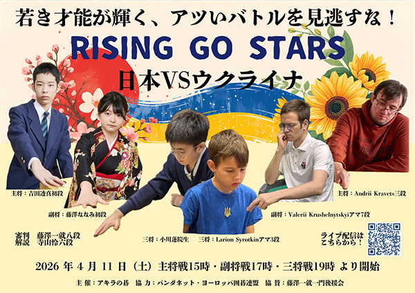 日本とウクライナの若手囲碁プレイヤーによるプロアマ対局企画「RISING GO STARS 日本対ウクライナ」を2026年4月11日(土)15時より開催いたします。