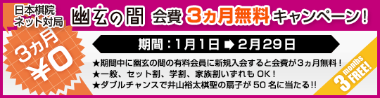 このたび、「幽玄の間」ではより多くの方に有料会員サービスをご利用頂くため、新規でご入会いただいた方には3ヶ月間の会費を無料とする「会費3ヵ月間無料キャンペーン」を実施いたします。期間中にご入会いただいた方には3ヶ月間無料でご利用頂けます。また、ダブルチャンスとして期間中に有料登録された方の中から抽選で50名の方に井山裕太棋聖の扇子をプレゼントします。