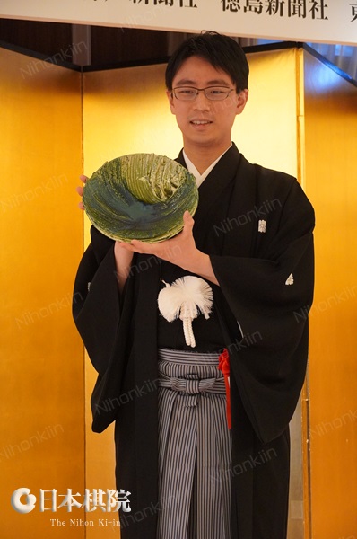 「緑釉鉢(りょくゆうはち)」を 掲げる一力天元。