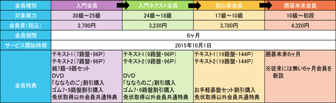 日本棋院は10月より「囲碁を知らない方」、「ルールはなんとなく分かるがどう打っていいかわからない方」、「19路盤でどう打ってよいかわからない方」を対象とした入門会員、入門ネクスト会員、初心者会員サービスを開始いたします。