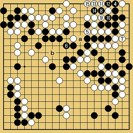 続いて黒4のオサエには白5が先手になるのがポイントです。手を抜くと白6のハネ出しでaとbが見合いとなり、どちらかの黒が取られてしまうので黒6は省けません。そこで白7から9、11が狙いの筋で右上が手になりました。