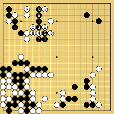 私が選んだ碁は第69回NHK杯戦の一力遼NHK杯vs.佐田篤史七段戦です。私はこの時、解説の聞き手として観戦していましたが、テーマ図の白14にサガられて、黒がこの後どうやってサバくつもりなのかさっぱり分かりませんでした。しかし一力さんは黒1と打ち込んだ時からこの展開は読んでいたはず。案の定すばらしい一手を用意していました。