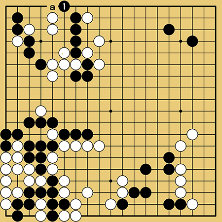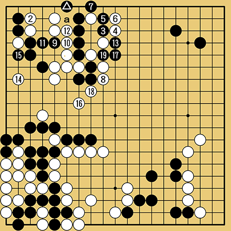 実戦は白2とさえぎりましたが、そこで黒3のツケコシから7までが一力さんの読み筋。黒aと生きる手が残ったのが黒▲の効果です。取りに行くなら白8でaと打つしかありませんが黒13と切られると外側の白が持ちません。佐田さんはやむなく取ることを諦めましたが、そうなると左上の白が生きていないので大変です。白16、18と援軍を送っている間に黒19まで上辺で戦果をあげて黒が勝勢になりました。