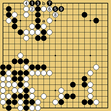 では実戦の黒1のコスミに白2なら黒はどうするのかというと、黒3のツギを利かして5という手を用意しています。白6には黒7、9できわどく脱出。黒aが利いているところなので白はbに打てないのです。