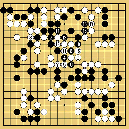 ここで菫ちゃんが打った白1が涙の一手でした。黒18までが実戦の進行で、黒は周りを傷つけることなく5目の地をつくって生きてしまいました。