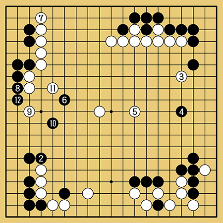 黒2、6は中央の模様を破りに来て、ふんわりと連絡。黒12で打ち掛けとなり、次の手が封じ手となりました。