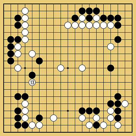 白13が渾身の一着。これが黒の形を崩し、流れを引き寄せる一手となりました。