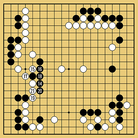 白21までとなった形は白がポイントをあげました。しかし、この碁はこれから二転三転して最後は劇的な逆転勝ち。私にとって大変嬉しく、記憶に残る戦いになりました。