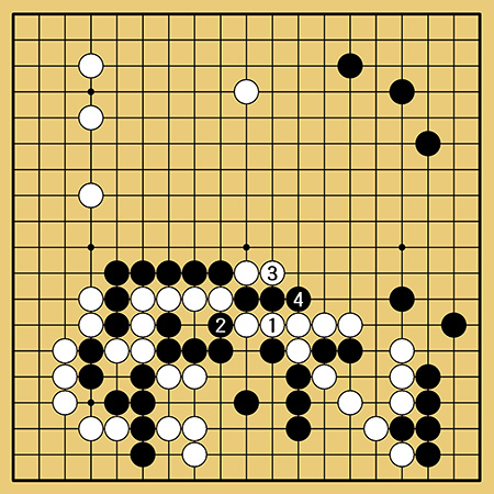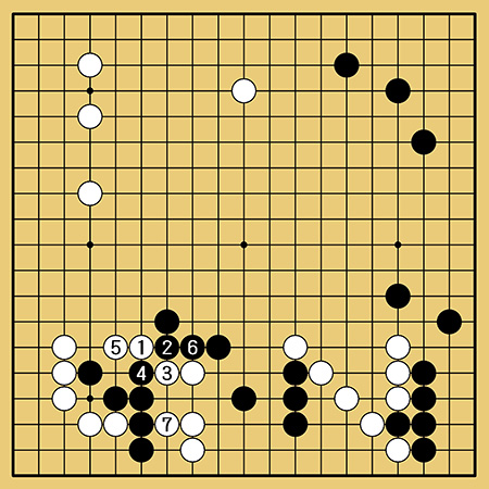 実戦は黒1の切りに対し、羽根先生も2図から5図までを読み切って白2と左辺を受けました。ただし、黒3と連打できれば黒は大満足。シノギ名人の羽根先生でもさすがにこれは大変そうです。「この一手」で芝野さんが勝勢になり、わずか97手で中押し勝ちとなりました。