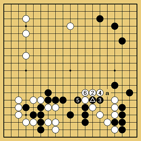 普通に考えれば白2、4とカカえられて黒▲は大悪手。しかし芝野さんは部分的に大損してでも黒5のアテが打ちたかったのです。次に黒aと打たれては大変なので当然白6とツギますが――、