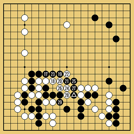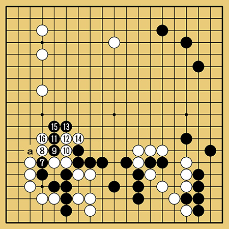 ここで黒7、9の出切りを発動させるのが狙いでした。黒15のツギのあとaのシチョウを防いで白16は必要な守りです。