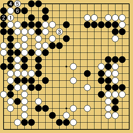 続いて白1、3と眼を作りにいくのは黒4、6でコウに持ち込まれます。