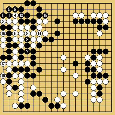 テーマ図は135手目を迎えて黒番。左辺で大変緊迫した状況で大石同士の攻め合いとなっています。