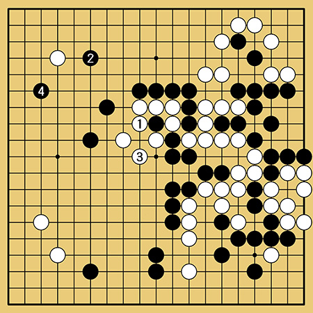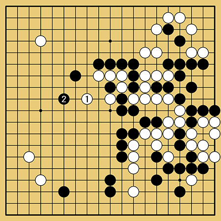わずかに白優勢という局面ですが、中央には白の不安定な石があります。白1には黒2と攻めて、左上を中心とした広い空間がどうなるか、という状況です。